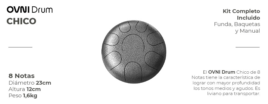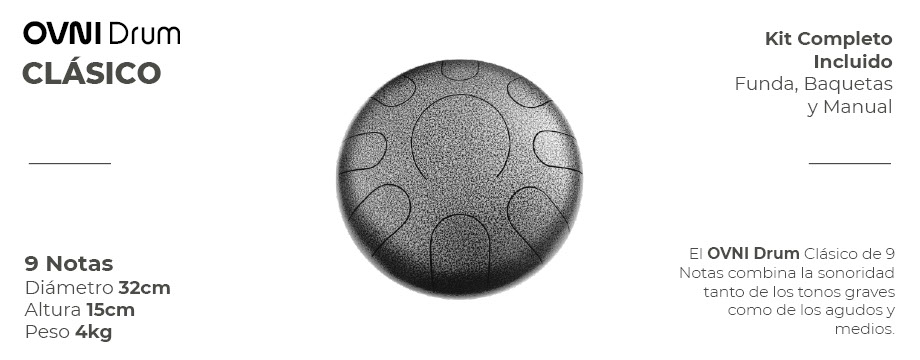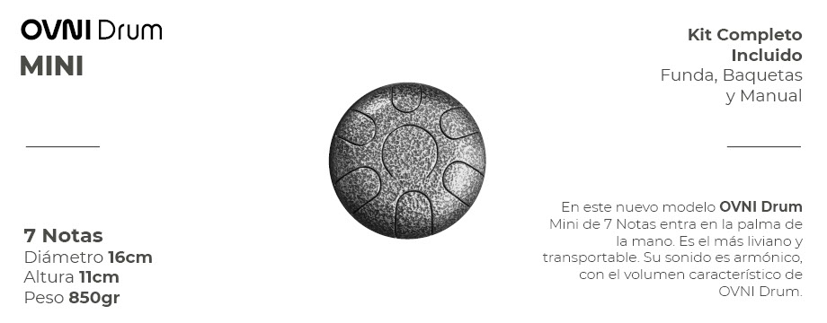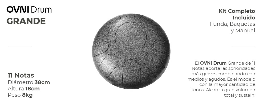 OVNI Drum es un Instrumento de Percusión Melódica de Lengüetas Metálicas (Steel Tongue Drum). Se puede tocar con baquetas de goma o directamente con las manos. Su sonido produce armónicos y vibraciones que se van multiplicando induciendo a quien lo escucha en un estado de relajación y armonización profunda por lo que también es buscado para armonizaciones, meditaciones, musicoterapia. La afinación y distribución de las notas lo hacen un instrumento intuitivo y fácil de tocar para todas las edades. Reproduce desde el tono C3 hasta el F5 comprendiendo un rango total de más de dos octavas